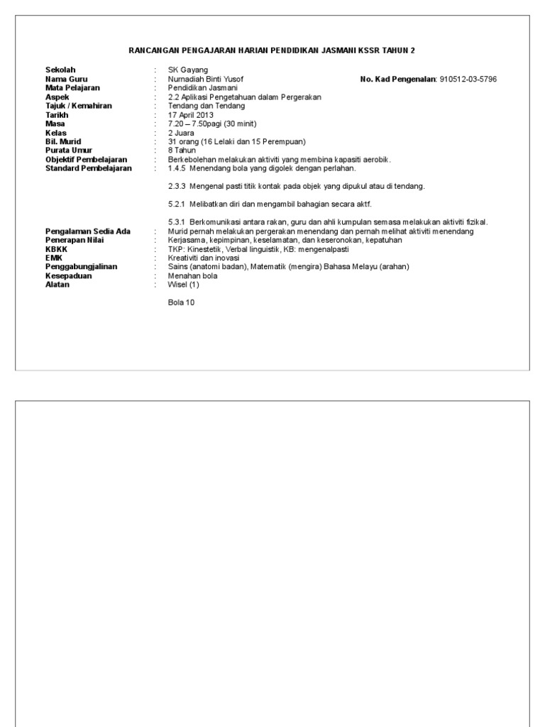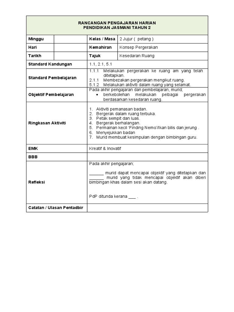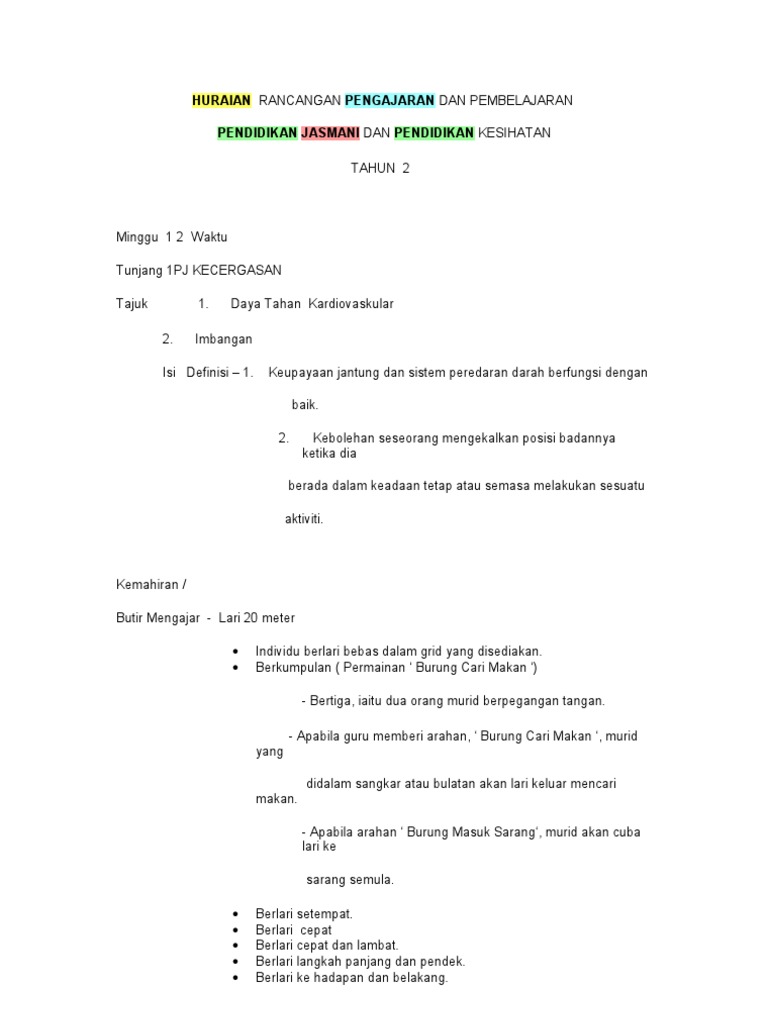 Pdf Rancangan Pengajaran Harian Pendidikan Jasmani Kssr Tahun 2 Rod Zie Academia Edu